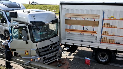 Kurz vor halb zehn Uhr vormittags kam es dann zu einem schweren Unfall am Stauende auf der A8 wenige Hundert Meter vor der Ausfahrt Merklingen. Der 60-jährige Fahrer eine Autotransporters bemerkte offenbar zu spät den vor ihm bremsenden Lastwagen. Im letzten Moment versuchte der Mann noch, einen Unfall zu vermeiden und riss das Steuer nach rechts. Mit der linken Führerhausecke blieb der auffahrende Lastwagen trotzdem am Heck des anderen Lkw hängen.