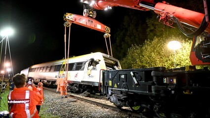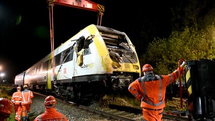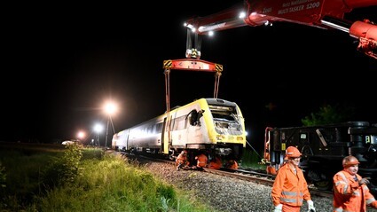 Nachdem am Dienstagvormittag ein Linienbus und ein Zug auf einem Bahnübergang bei Blaustein-Arnegg (Alb-Donau-Kreis) zusammengestoßen waren, wurde der entgleiste Zug noch in der Nacht geborgen. Zwei Schienenkräne kamen aus Fulda, um den Triebwagen anheben und wieder in das Gleis setzen zu können. Nachdem der Schienenkran im nahegelegenen Bahnhof Blaustein-Herrlingen für den Einsatz vorbereitet wurde, dauerte das Anheben und Eingleisen nur wenige Minuten. Danach wurden alle losen und überstehenden Teile des verunglückten Zuges entfernt, dabei kam auch ein Trennschleifer zum Einsatz.