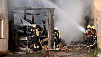 Von zwei Drehleitern aus und mit mehreren Strahlrohren am Boden wurde das Feuer gelöscht. Nach ersten Erkenntnissen der Polizei waren in der Halle mehrere Fahrzeuge untergestellt und es waren wenige Hundert Liter Heizöl gelagert. Die Brandursache ist noch unbekannt, den Sachschaden an der komplett niedergebrannten Halle schätzt die Polizei auf mindestens 300 000 Euro.