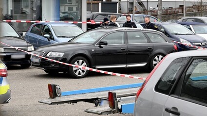 Bilder zeigen rechts an der hinteren Seitentür eines schwarzen Kombis eine geborstene Scheibe, Löcher sind auf der Tür zu sehen. Verletzt wurde niemand. Die Polizei rückte mit starken Kräften aus. Zu den Hintergründen machte die Polizei auch am Mittwoch keine Angaben.