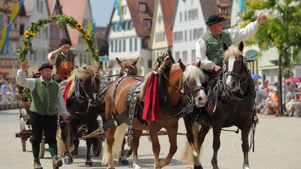 Der Historische Festzug ist für viele hier das absolute Highlight beim alljährlichen Biberacher Schützenfest. Und man sieht auch jetzt schon wieder in der ganzen Stadt Menschen jeden Alters, die sich Richtung Marktplatz aufmachen, Schützenrosen und Abzeichen am Revers, blaugelbe T-Shirts, Strohhüte und natürlich Fahnen überall.