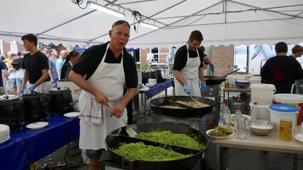 Soweit das Auge reicht werden hier Spätzle in "älle Variationen" angeboten und verkostet. Sie haben die Qual der Wahl, ob Spätzle mit Linsen und Saiten oder doch Schinkenspätzle, nein Kässpätzle müssen es wieder mal sein oder doch lieber Spinatspätzle mit Champignonrahmsoße, Spätzle mit Schaschlik, Spätzle Bolognese oder Spätzle zum Rollbraten, der am Sonntagmittag serviert wird. Noch nicht genug Auswahl ... wie wäre es dann vielleicht mit leckeren Kässpätzle, Krautspätzle oder für unsere Kleinsten "Spätzle mit Soß"?