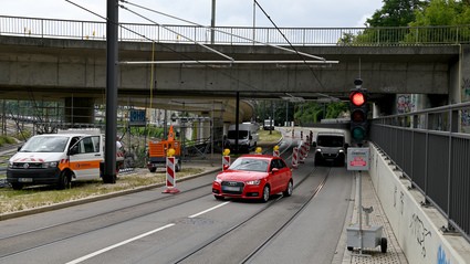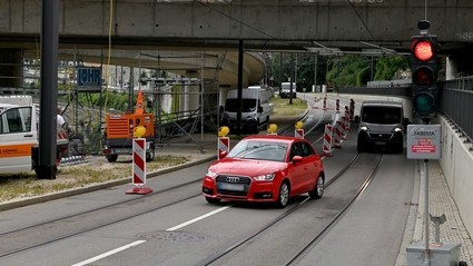 Eine Baustelle unter der Wallstraßenbrücke führt sogar oberirdisch zu Staus. In dieser und der nächsten Woche wird die Brückenrampe von der B10 in Richtung Alter Fritz und Eselsberg verstärkt. Die fortschreitende Alterung der Brücke macht es notwendig, die vorhandenen Spannglieder des vorgespannten Stahlbeton zu verstärken und zu entlasten. Bauarbeiter arbeiten dazu überwiegend im Inneren des Brückenkasten, müssen aber auch die Brücke zur Seite hin durchbohren.