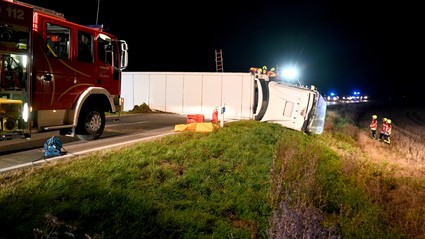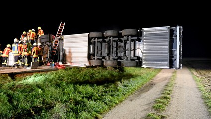 Ein Bergeunternehmen begann noch in der Nacht mit der Arbeit, möglicherweise muss der Auflieger vollständig ausgeladen werden, um den Lastzug mit zwei Kränen wieder aufrichten zu können. Die Strecke zwischen Dornstadt und Nellingen verläuft parallel zur Autobahn 8 und ist die Bedarfsumleitung zwischen den Ausfahrten Ulm-West und Merklingen. Angaben zur Schadenhöhe konnte die Polizei in der Nacht noch nicht machen.