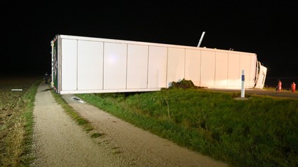 Kurz nach halb elf Uhr abends war er mit seinem Kühllastzug unterwegs zwischen Dornstadt und Nellingen, als er aus noch unbekannter Ursache in einer leichten Linkskurve nach rechts von der Fahrbahn abkam.